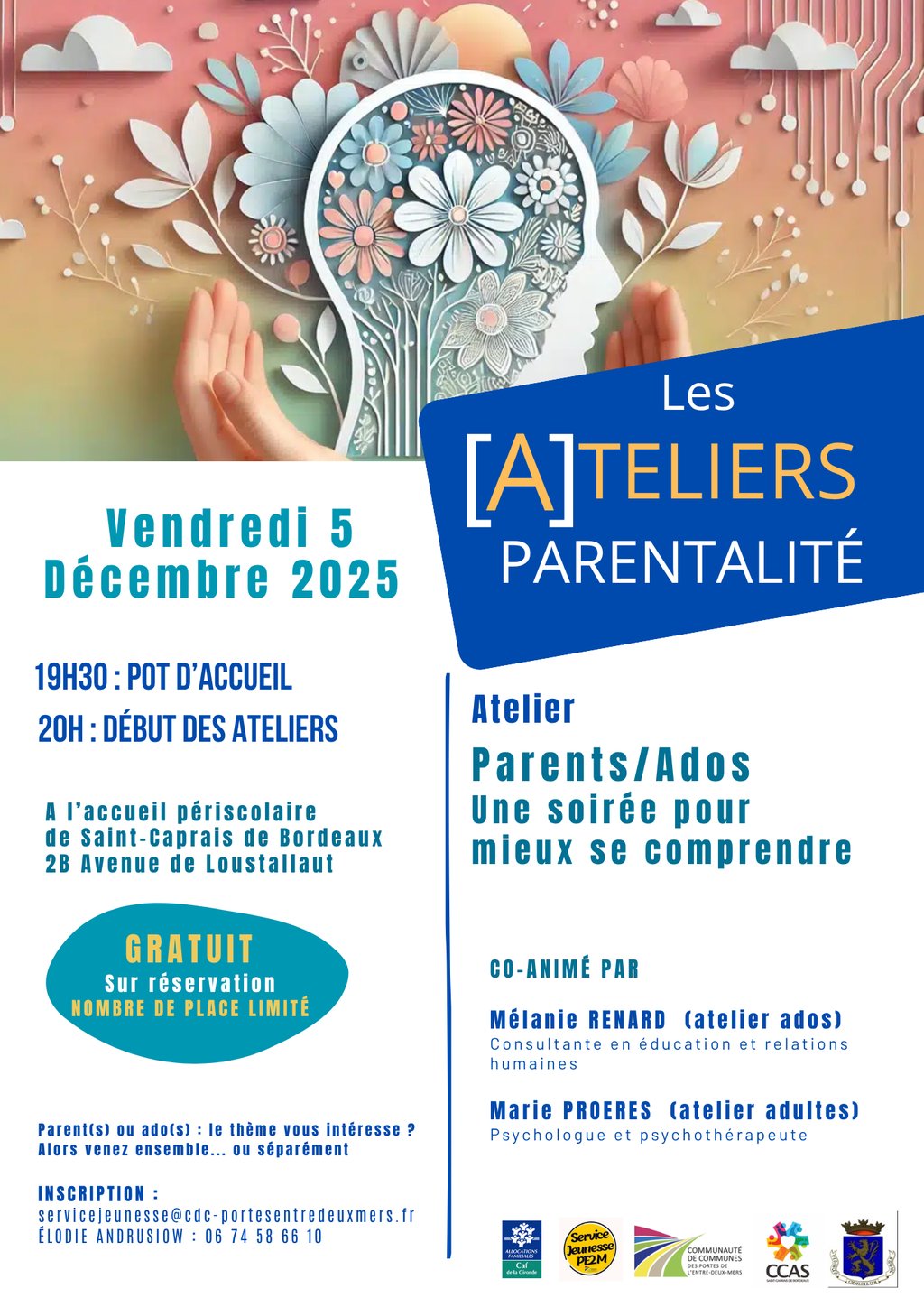 Dans le cadre de la thématique parentalité du projet social du territoire, le Service Jeunesse PE2M, en partenariat avec le CCAS de Saint Caprais de Bordeaux, organise un nouveau RDV parents et adolescents
