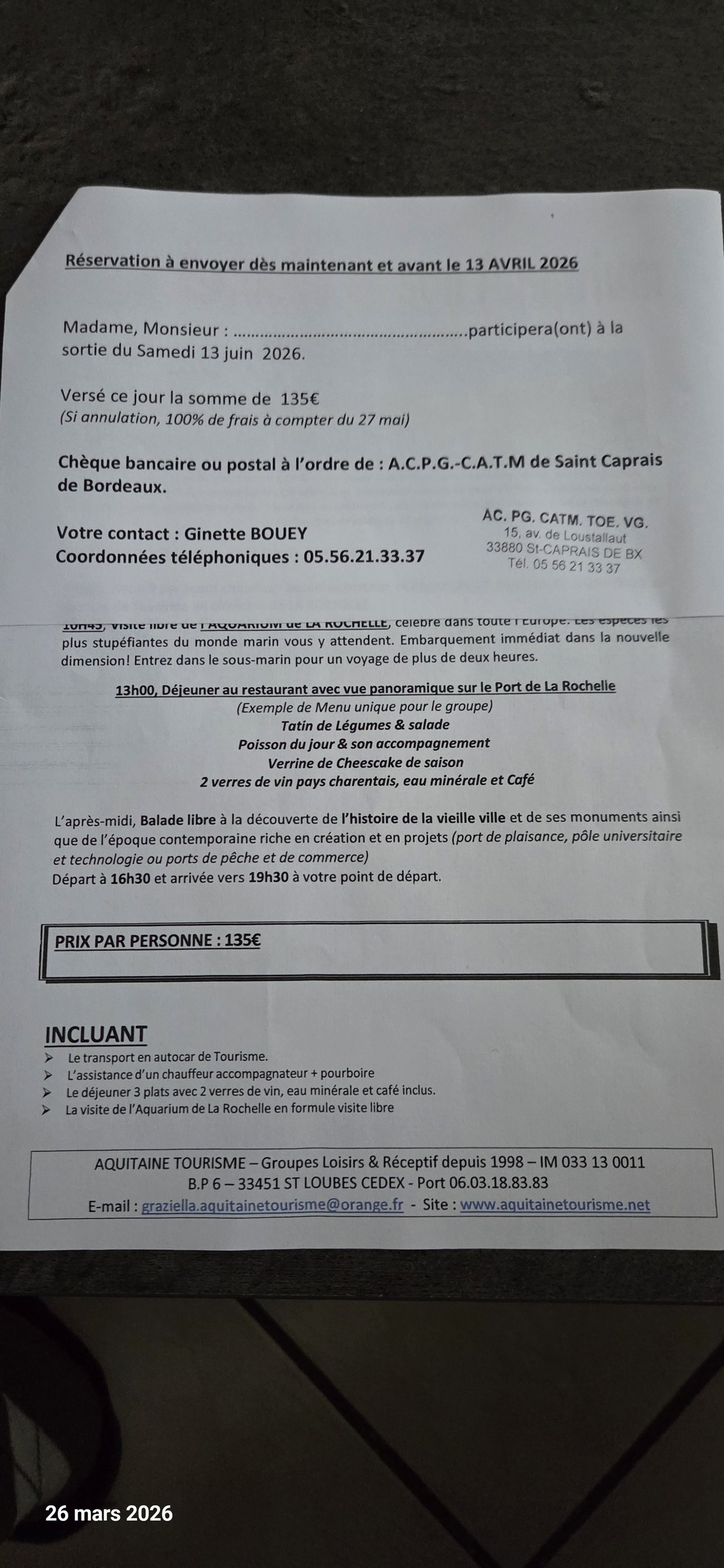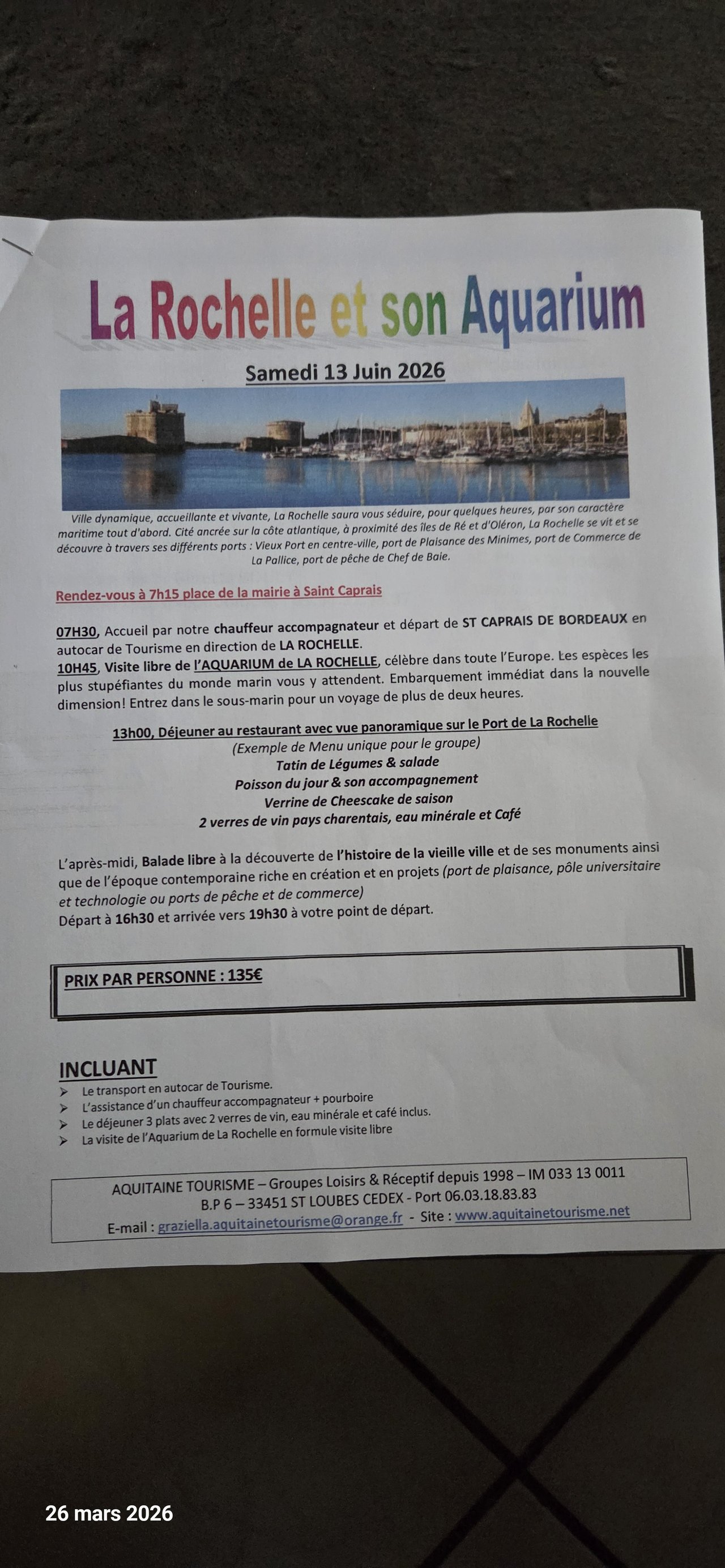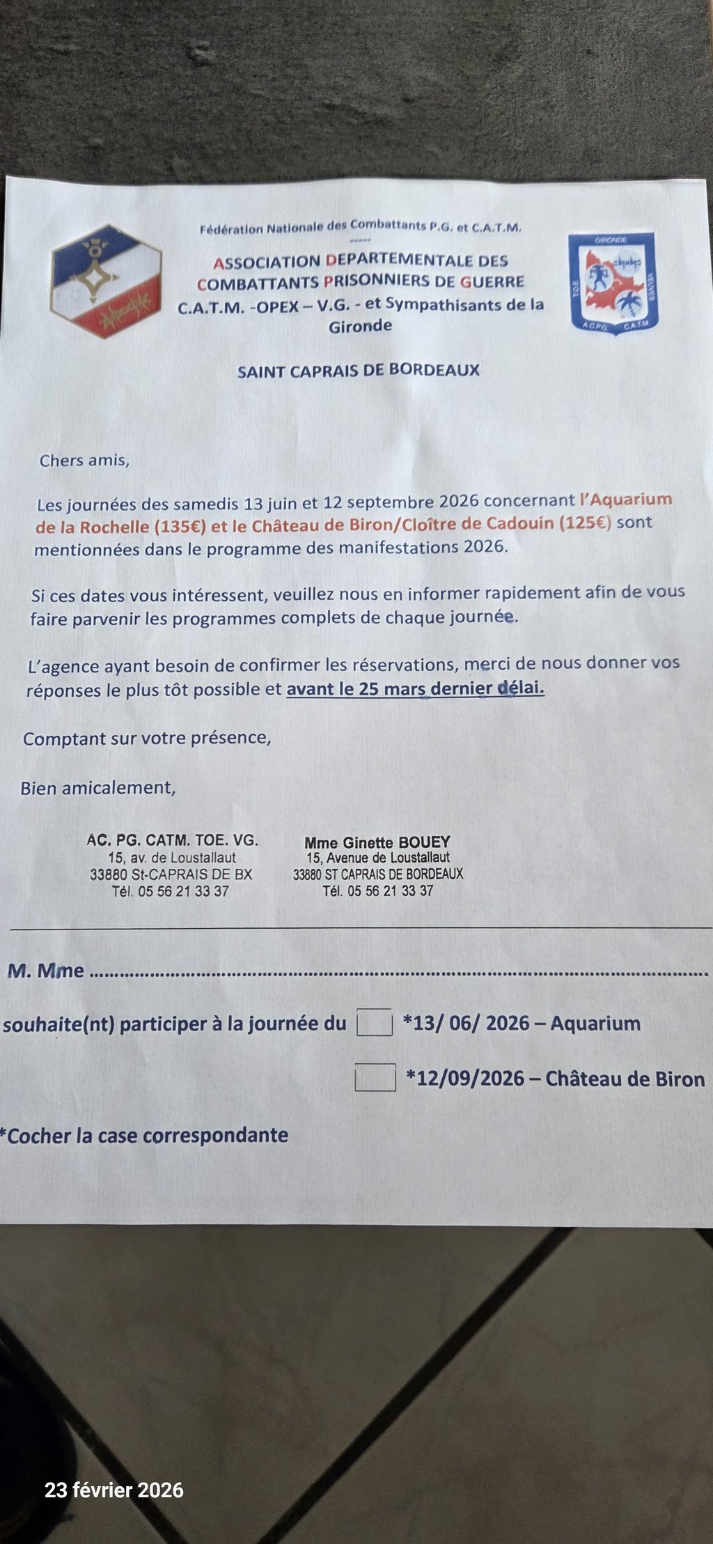 Les journées des samedis 13 juin et 12 septembre 2026 concernant l'aquarium de la Rochelle (135€) et le château de Biron/cloître de Cadouin (125€) sont mentionnées dans le programme des manifestations 2026.